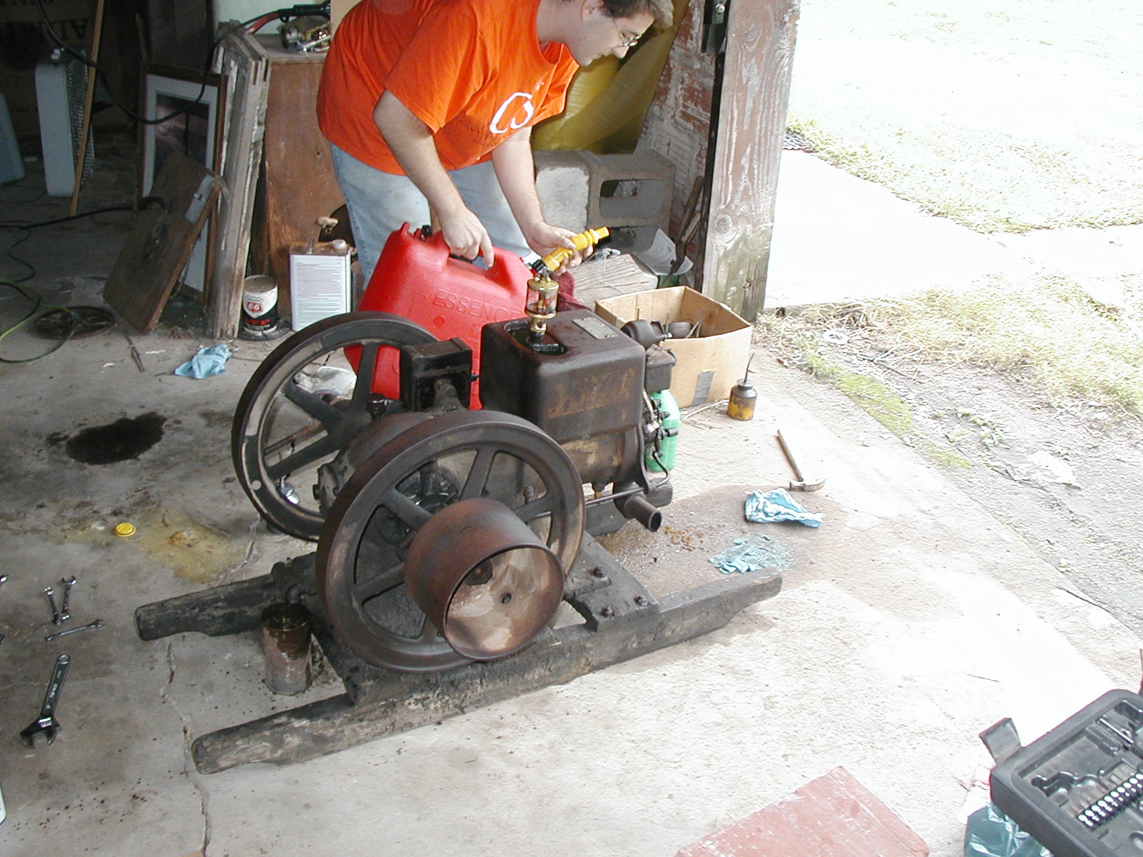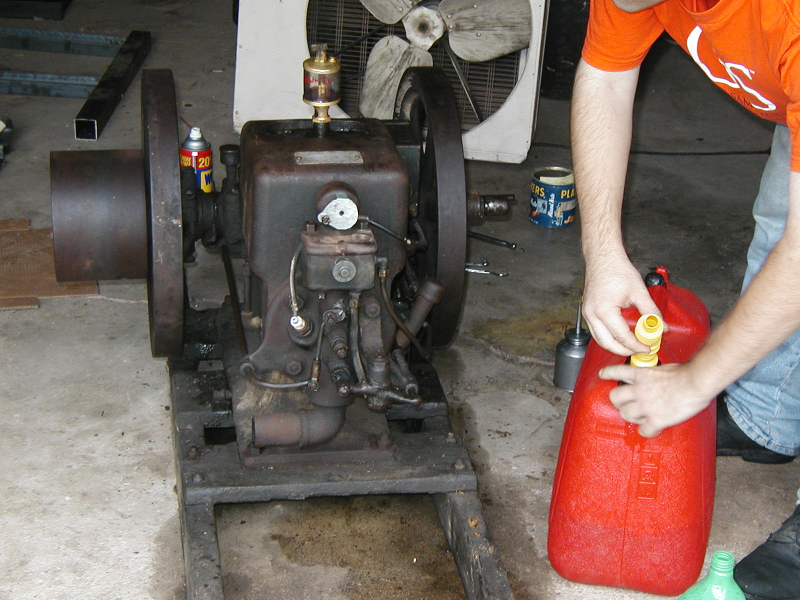 This photo is a little brighter. I am pouring gasoline into a small container so that I may prime the mixer.