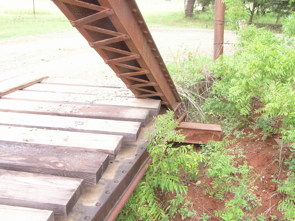 below, detail of connection of endpost and lower chord. The lower chord appears to have been recycled from a pin-connected bridge. In its present form, this connection is welded.