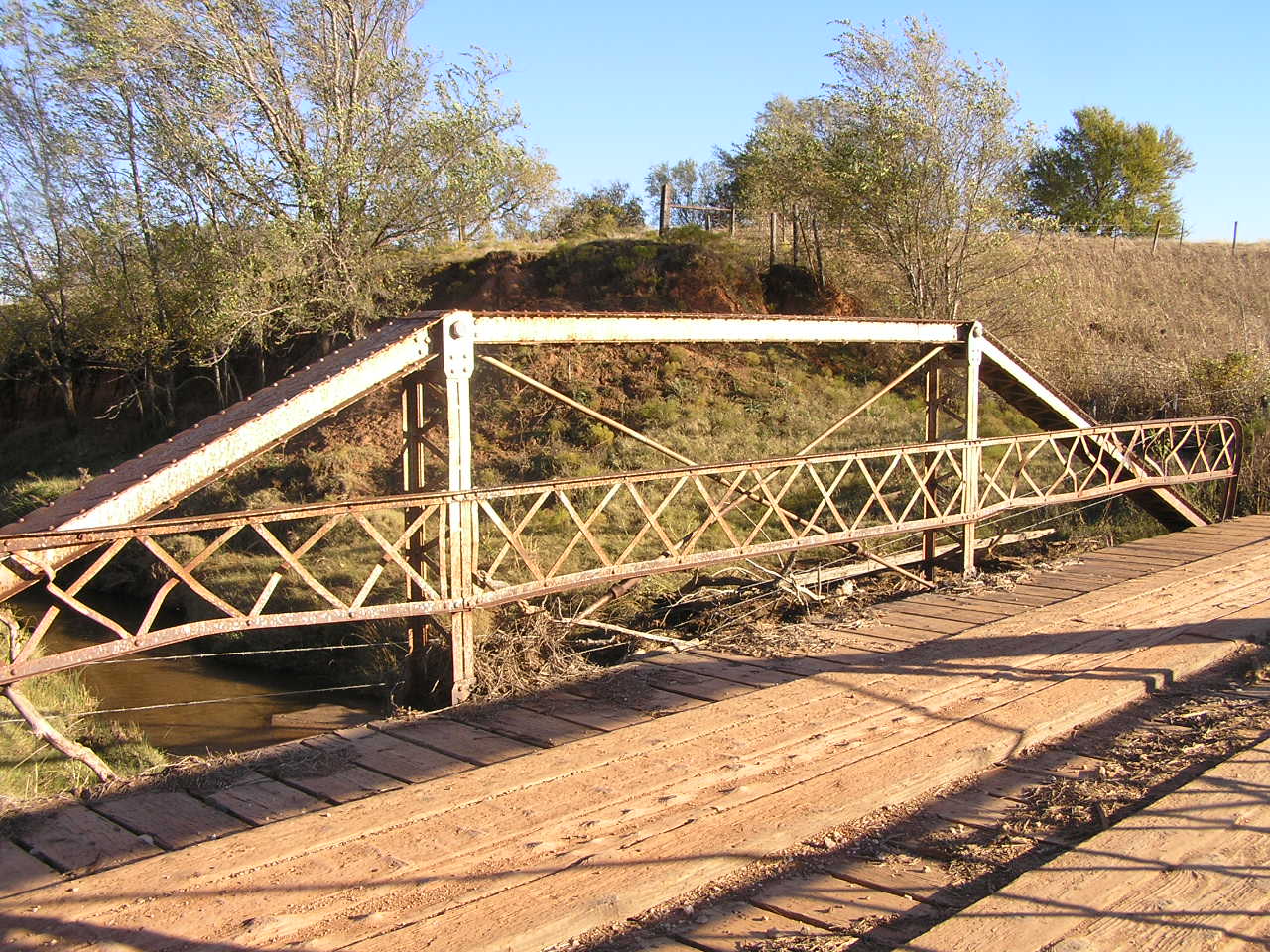 Built in 1920, this old girl has seen better days. Located west of Hillsdale in the very northwest corner of the county, this Queen post pony truss still serves traffic on a north-south road. Above, a view though the structure. The pin-connected truss is 41 feet in length, and together with the approach span the bridge 63 feet long.