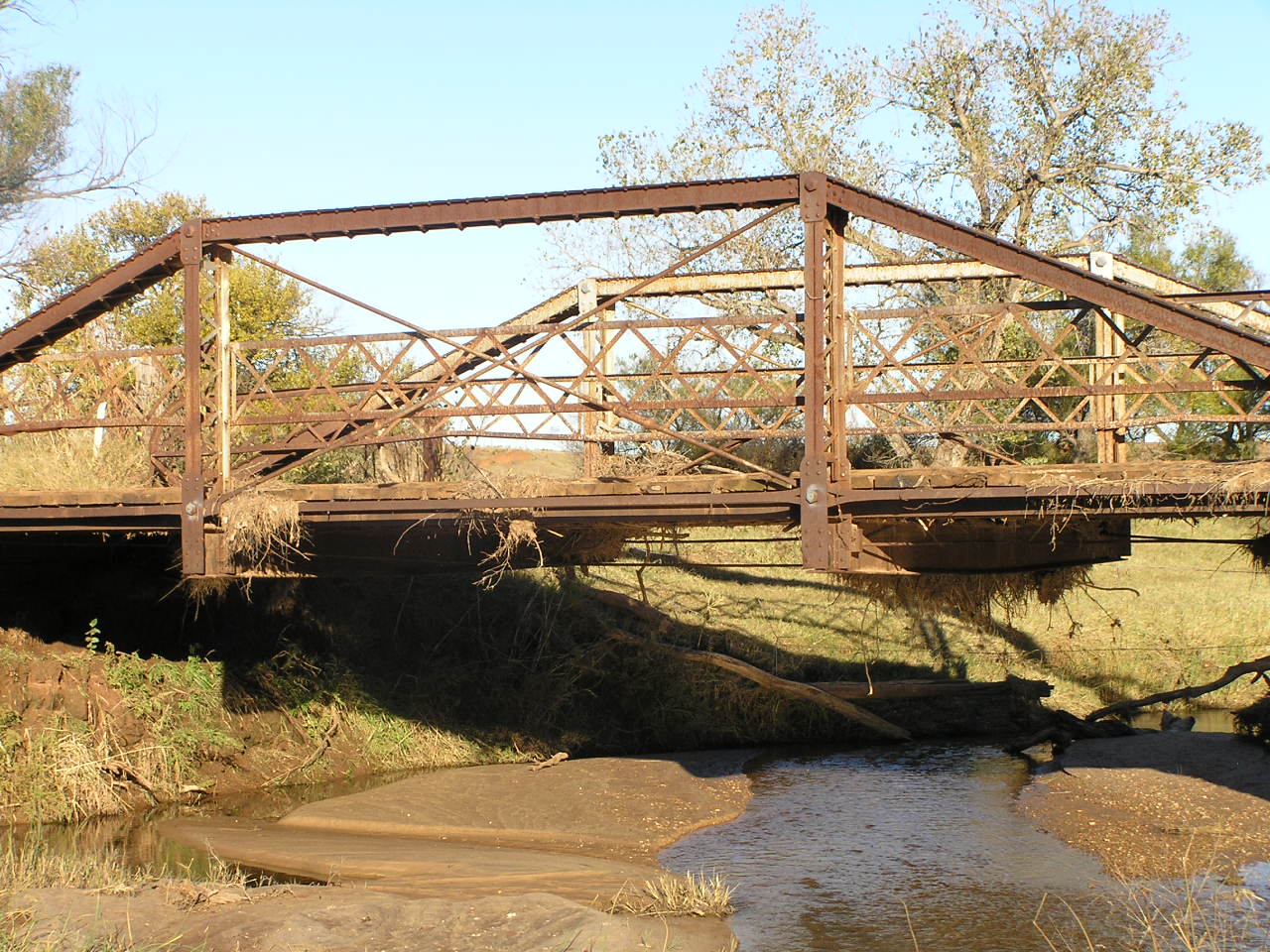Below, a side view of the truss span. Note that the south pier looks new, or newer. It is possible this was originally an abutment, and the creek's southward creep made adding a pier and approach span necessary.