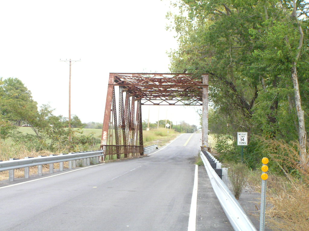 Built in 1929, this 100-foot long Modified through Pratt truss spans Pecan Creek east of Taft. Below, a view looking east thru the bridge. The modified Pratt thru truss was a popular state-designed bridge in Oklahoma for spans from 100 to 120 feet.