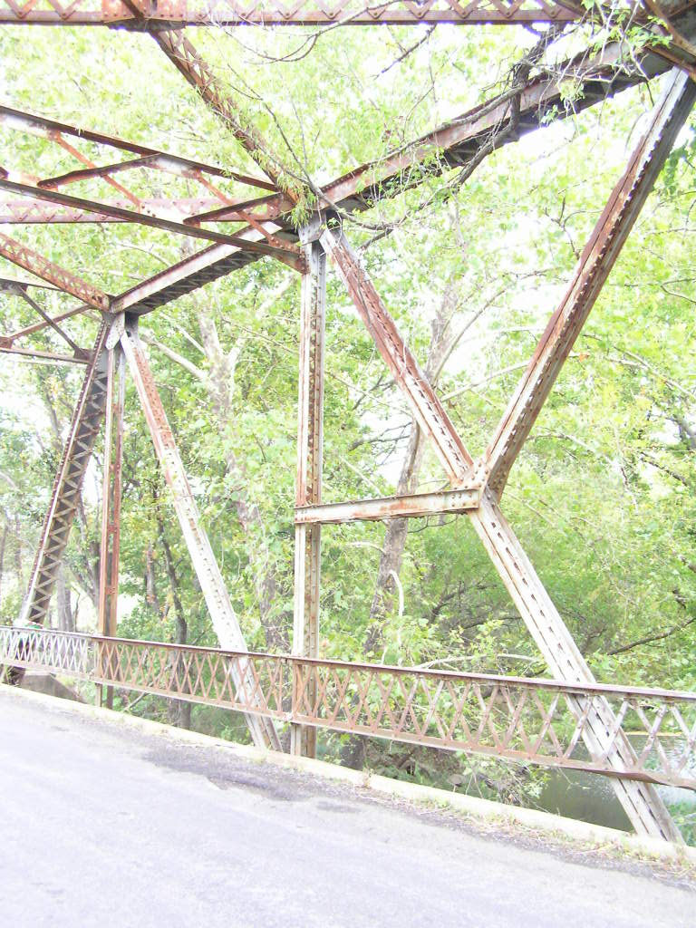 Above, close-up of the truss The extra members in the center two panels allowed for an increase in capacity without greatly increasing the size of the compression members. Note the extensive use of lacing here. The original concrete deck has been surfaced with asphalt.