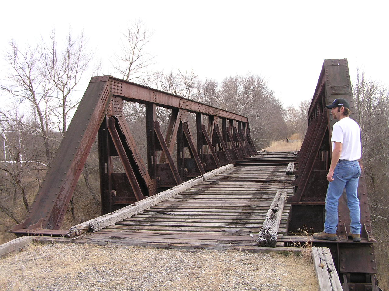 The long defunct Midland Valley Railroad has left Osage County with a rich collection of abandoned railroad structures, such as this bridge south of Barnsdall on the old mainline. Built in 1905 by the Pennsylvania Steel Co., of Steelton, Pa, this is a massively constructed riveted Warren pony truss. Above, bridgehunter Ken Parker serves a scale at the endpost in this through view of the structure.