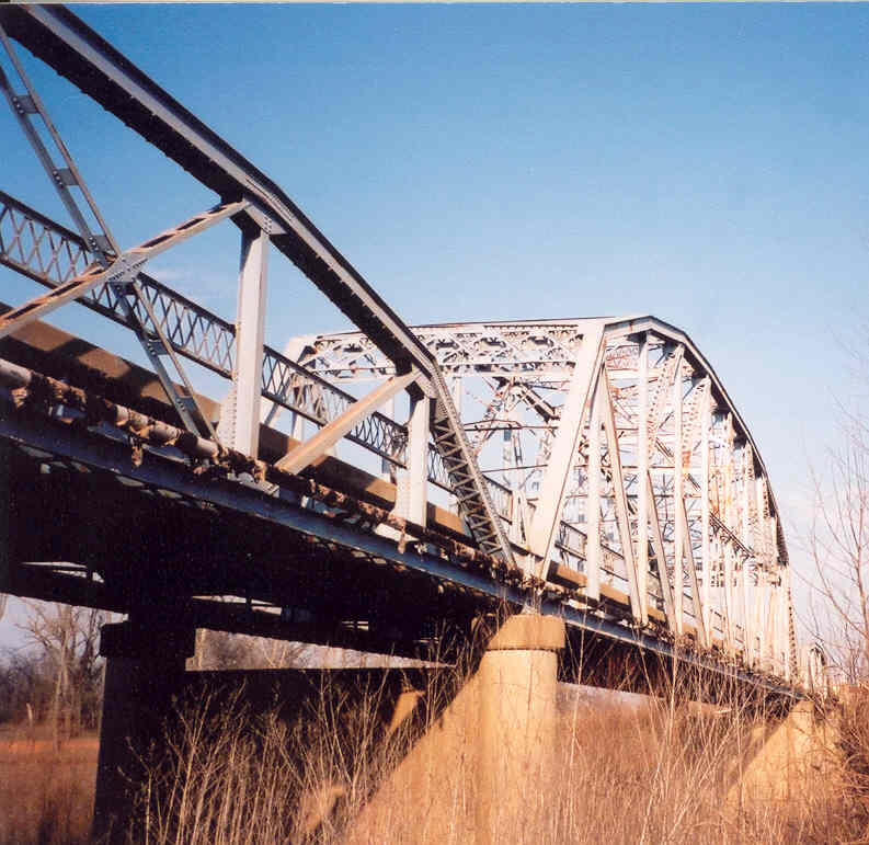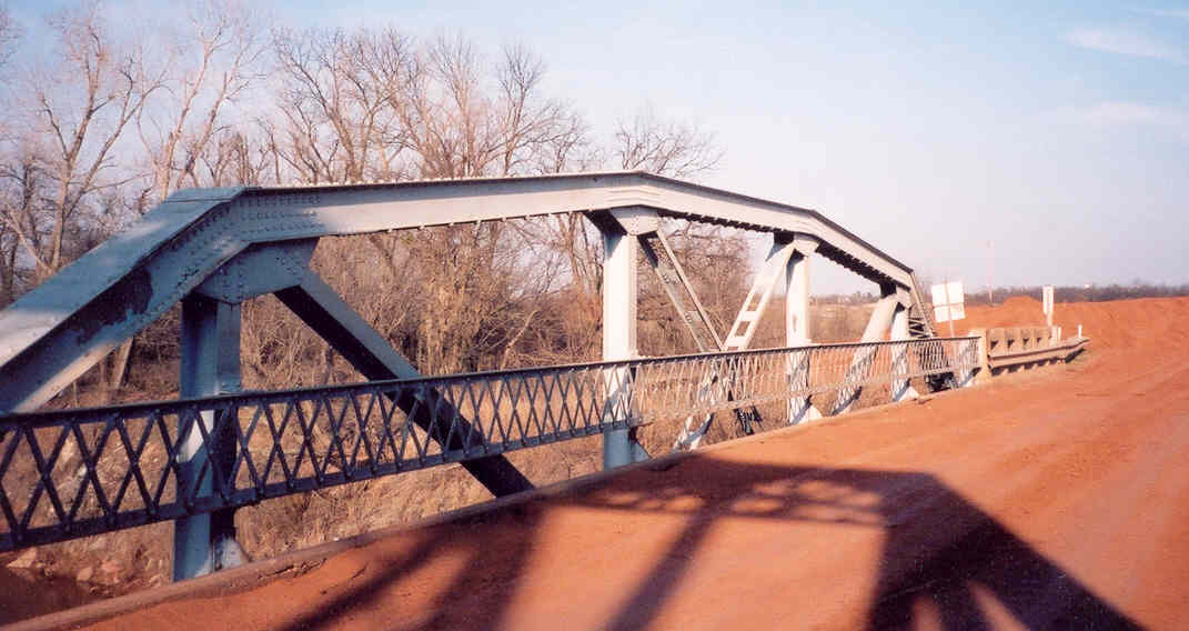 Below, a view from under the bridge of the side. The main span was a 210-foot long K-truss, one of the earliest of its type in Oklahoma. The two pony approaches are the old reliable 100-foot Parker design.