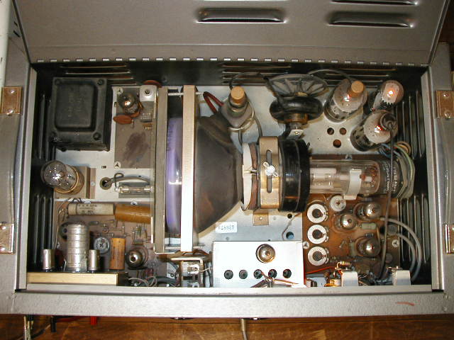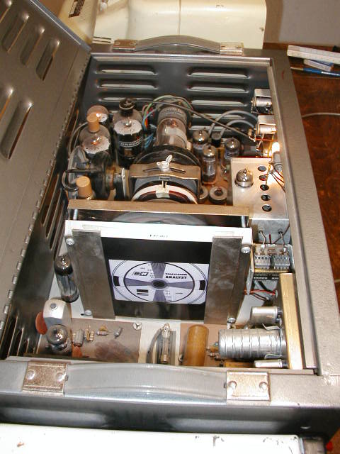 Below is another picture of the interior of the 1076, taken with a flash. Note the two Horizontal output tubes. One of these tubes drives the CRT deflection coils and flyback for the flying spot scanner, the other is used as a vertical or horizontal plate driver.