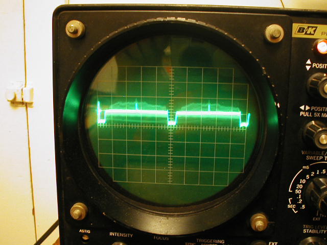 Below, the scope trace for the video signal being displayed above. The deep valleys are the horizontal sync pulses.