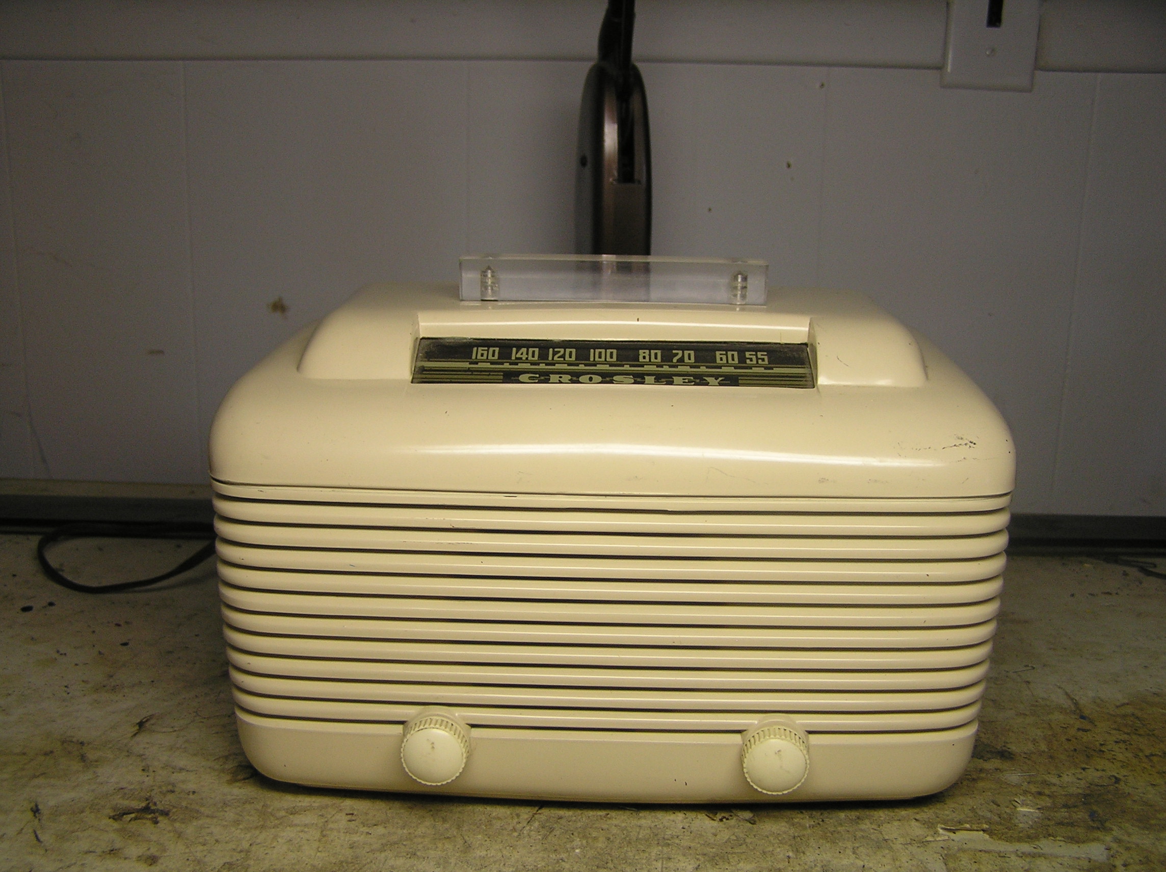 Above, The ivory painted Bakelite cabinet is in untouched original condition. When I initially saw this set in a local antique shop, I thought the clear handle was a later addition by a previous owner, and had passed on it the first few times I saw it in the shop. Flipping through and seeing pictures in the Rider's manual, however, confirmed that the ivory versions of this radio had the handle, the unpainted brown version does not. So, the next time I was in the shop, I picked it up. This is a nice post-war style radio, but you'll note an unusual feature: the dial is backwards from the common arrangement of low to high going left to right.