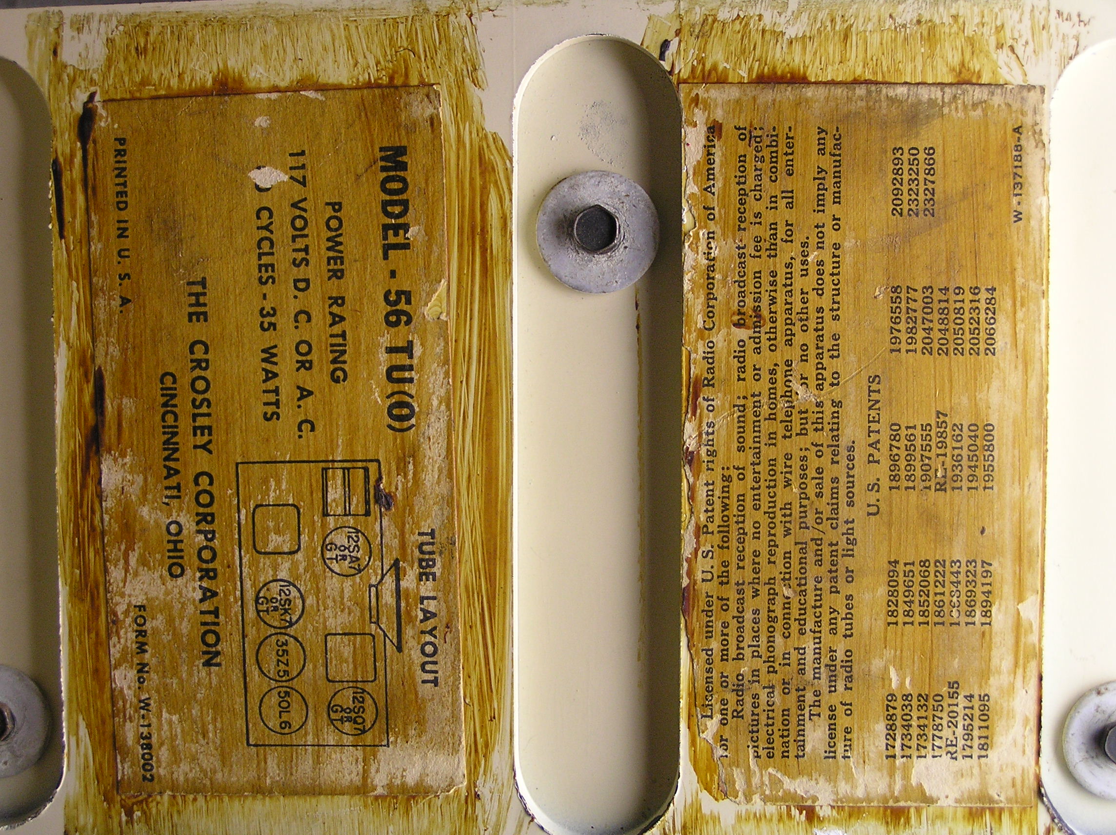 Below, the labels pasted under the cabinet. The (O) designation signifies octal tubes, the 56 TU uses loctal tubes.