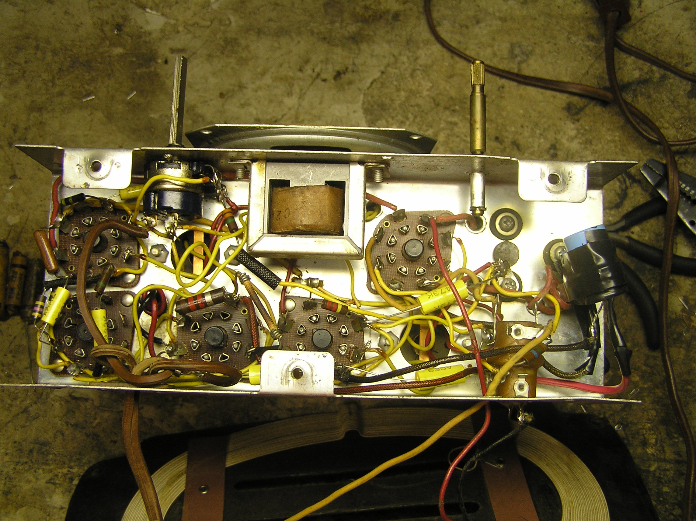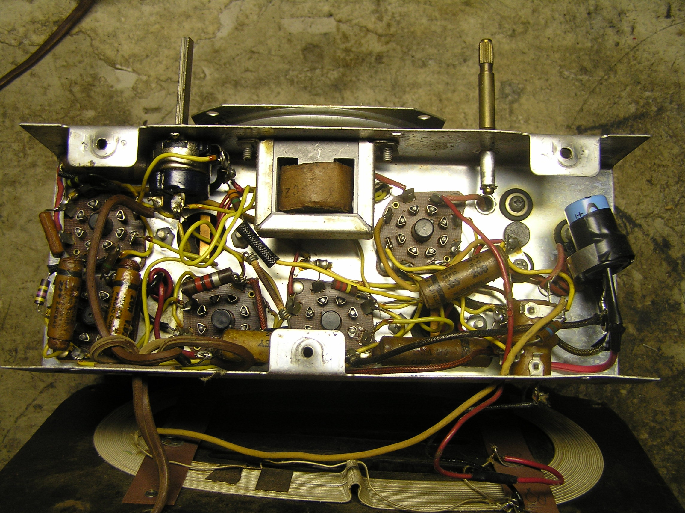 Since I wanted to use this set, I went ahead and replaced the six paper capacitors. This was a relatively straight-forward set to work on, and the work was made easier by the fact that the leads were only loosely wrapped around the terminals. The hardest part was the capacitor from the B- to chassis, because the chassis end lead connects under the oscillator coil.