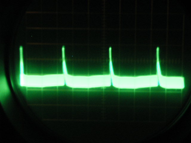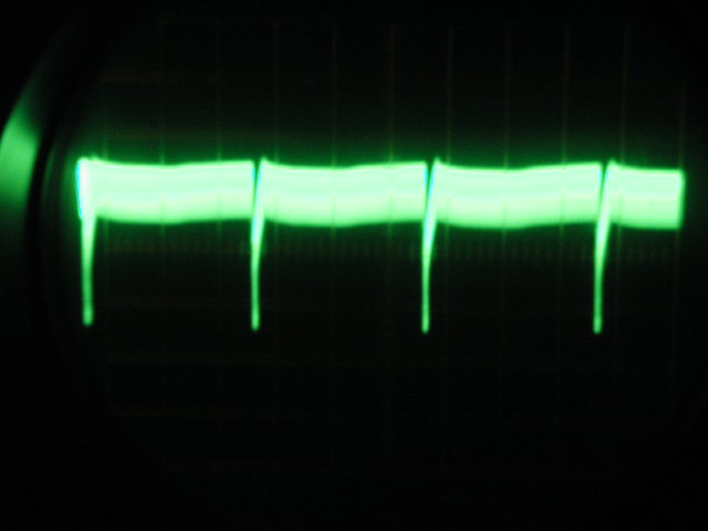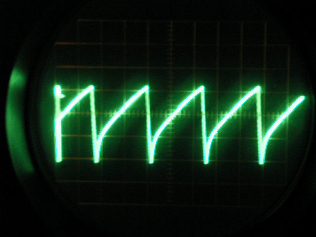 Above, AGC (automatic gain control) keying pulse, generated by a B&K 1076 TV Analyst. These are often called saw-tooth waves. To me, they look like the teeth in a recoil clock escapement. The frequency of this signal is 15,750 Hz.