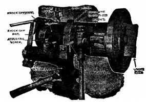 Fig. 900.—The crab claw releasing gear; view showing parts. In operation, the admission arm is moved by the steam rod to the right giving outside admission. When in its movement the crab claw is depressed by the knock off cam, the hook die releases the stud die, and the valve is suddenly closed by the dash pot thus cutting off steam.