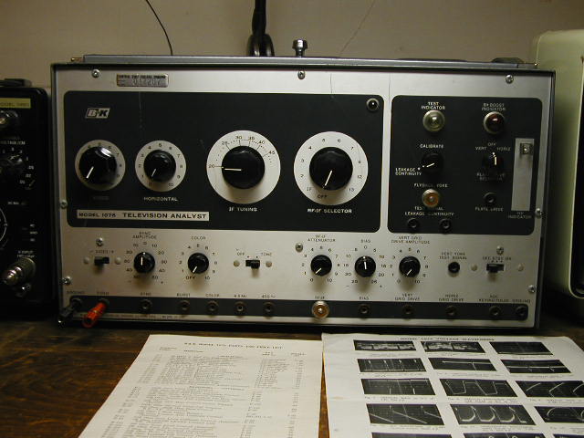 The above picture is my 1076 TV Analyst, with some of the paperwork that goes with it. On the left is the parts list/schematic, on the right is a chart of typical waveform traces. Below is a close view of the 1076.
