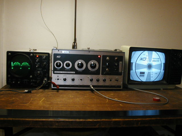 Like I said, the 1076 is a powerful tool for TV servicing. One thing it can do, which I shall display here, is the ability to generate test patterns and RF frequencies. The photo below shows the 1076 connected to a Black-and-white TV set thru its own RF generator. The scope, also by B&K, is connected to the 1076's video output.