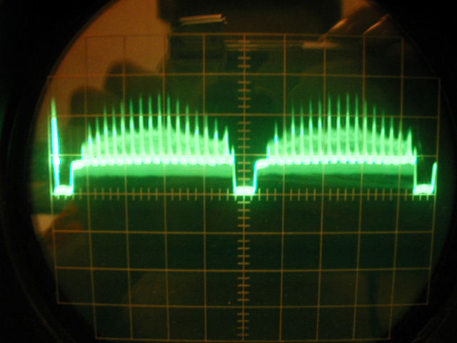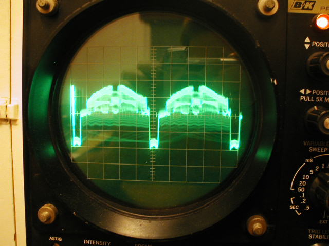 Below, the scope trace for the video signal being displayed above. The deep valleys are the horizontal sync pulses.