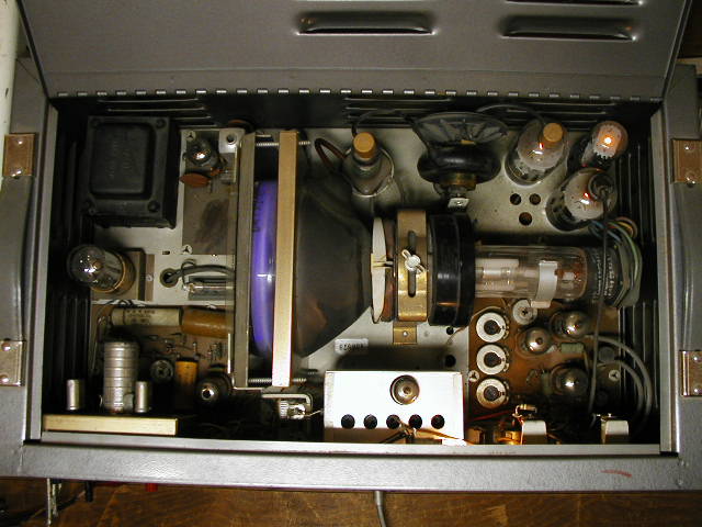 How does the TV analyst produce these images? Inside the 1076 is a flying spot scanner. To the left is a photo multiplier tube, to the right is a conventional CRT with a purple (violet) phosphor. The photo multiplier tube is most sensitive to this color.