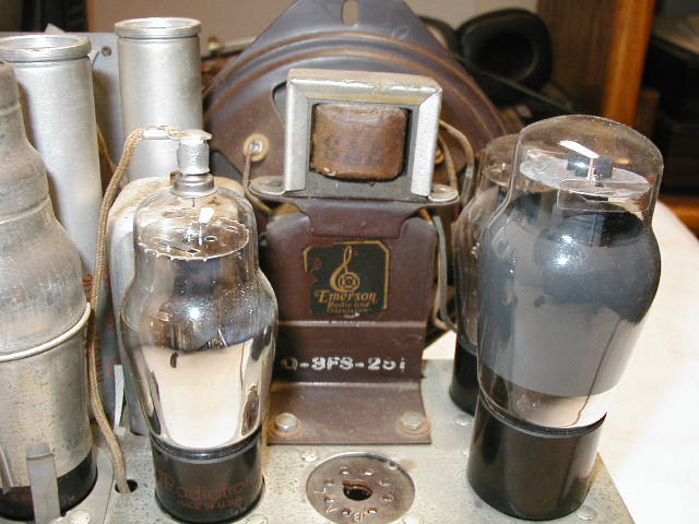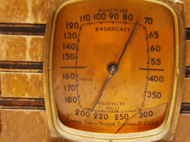 The cabinet is in better shape than this photo makes it seem. The Emerson treble clef decal between the knobs is still in good condition. This radio is designed for regular AM broadcast band, and Short Wave. The bandswitch is on the back. The left knob is for volume, the right is for tuning.
