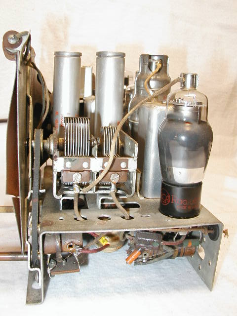 Above, a detail of the RF end of the chassis. The short piece of wire sticking out the back of the chassis at the right is the antenna wire. It connects to the left most section of the tuning capacitor and to the top cap of the 6A7 tube. Note the belt drive connecting the tuning knob shaft to the tuning capacitor.