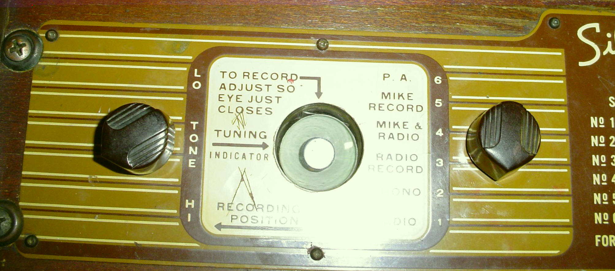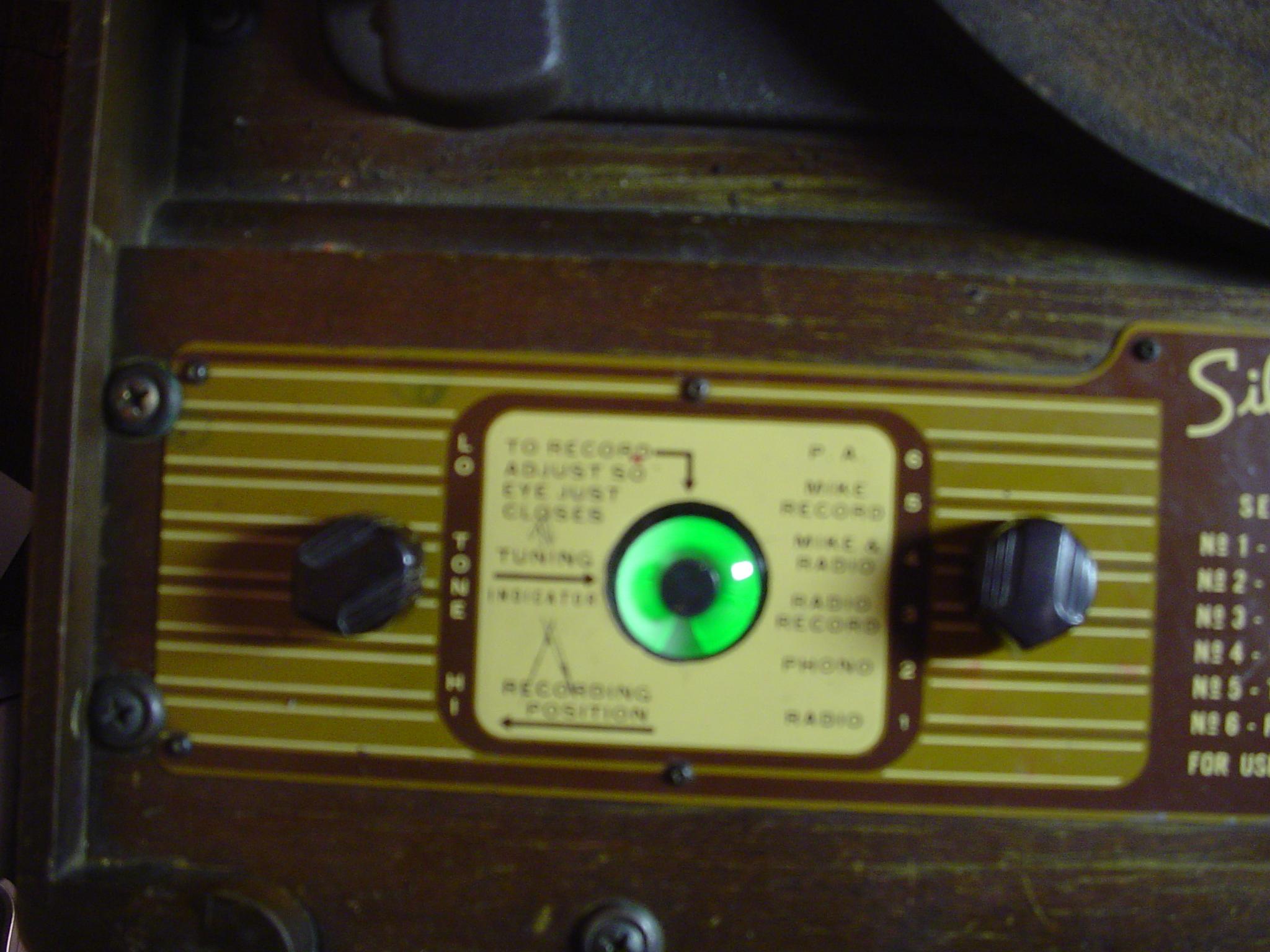 This very nifty radio unit was purchased at an auction in Chandler, Oklahoma in the summer of 2002. It is one of the most interesting radios to ever live in my collection. It can play and record records (it could, that is, the crystal head are shot) from the radio, a microphone, or both together. A classy tuning eye tells you when you've got the station tuned in on the radio receive mode, and indicates record volume on all other settings. On yet another setting, the unit can be used as a PA system, and the tuning eye will indicate volume.