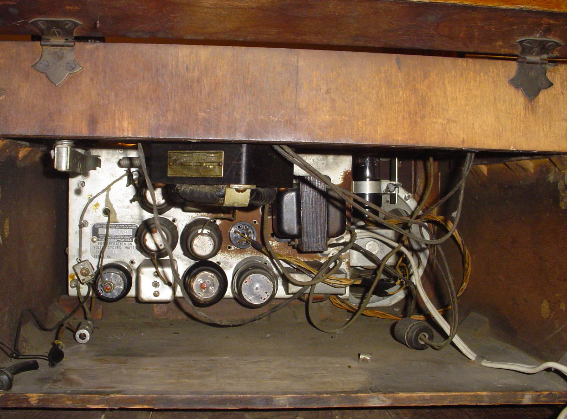 The photo below shows the chassis, phono motor and all the big shouldered glass tubes. I did a complete electronic restoration of this set and it now plays great! In my restoration, I also added a 1/4" jack to the microphone lead wire, since the original end had already been messed with many times. Note the ordinary cabinet hinges for the lid.