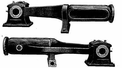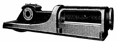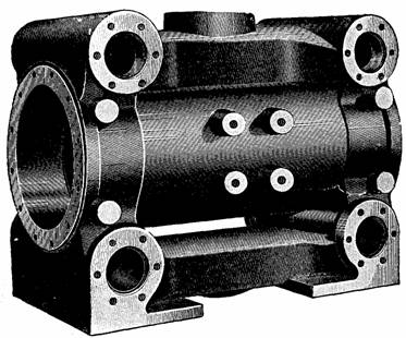 Fig. 851.—A Corliss cylinder, with lagging, valves, etc., removed to show construction. The transverse cylindrical chambers at the end are for the valves; those for admission being on top, and those for exhaust at the bottom, thus affording natural drainage. Steam and exhaust passages connect each pair of valves; the exhaust passage being placed at a distance from the cylinder so that the exhaust steam at comparatively low temperature will not absorb heat from the steam within the cylinder and thus cause condensation before release. The long stroke gives small clearance.