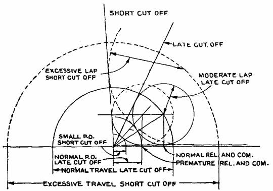 Fig. 854.—Bilgram diagram illustrating some defects of the slide valve; 1. excessive travel when designed for short cut off; 2. reduced port opening at short cut off with shifting or swinging eccentric; 3, premature release and compression at short cut off with shifting or swinging eccentric. These defects have been explained at length in the chapter on the slide valve.