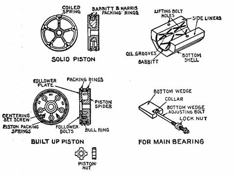 Figs. 856 to 864.—Details of Corliss engine construction. Figs. 856 to 861 piston details; figs. 862 to 864, end of frame with details of main bearing.