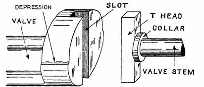 Figs. 869 and 870.—End construction of a Corliss valve and stem. The depression in the cylindrical section of the valve permits it to raise from its seat; there is a slot in the end of the valve for the T end of the stem.