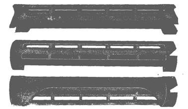 Figs. 871 to 873.—Providence Corliss valves. fig. 871, double piston inlet steam valve; fig. 872, view of steam valve showing opening edges; fig. 873, triple ported exhaust valve.