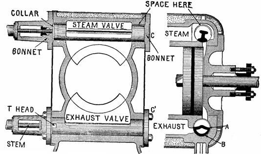 Figs 874 and 875. —Two sectional views of a Corliss cylinder showing valve assembled. The small clearance should be noted, also the space for valves to raise from their seats. The space from A, to B, allows access of steam which presses the exhaust valve firmly against the port to prevent leakage.