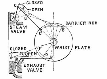 Fig. 881.—Illustrating the peculiar action of the wrist plate and valve rods which produces a rapid opening and closing of the ports, with a slower movement during the closed periods. This reduces wire-drawing, thus utilizing the steam to better advantage.