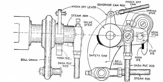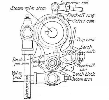 Fig. 895.—Bates inertia releasing gear. The dash pot arm is a bell crank, one arm carrying the dash port rod and the other the latch block. The dash pot arm is keyed to the steam valve stem and a hub on its inner side fits into a bored recess in the steam bonnet which increases the bearing surface. The steam arm is driven by the valve rod in the usual way. A substantial boss carries the latch shaft to which the knock off bar is firmly keyed. The knock off ring is controlled by the governor, through the governor rod, and carries the trip cam and safety cam. The latter only comes into operation so the event of some mishap to the governor, when it is thrown into such position that the valves cannot be opened. In opening the valve, the valve rod moves to the left and the latch shaft engages the latch block in the position shown, and continues in its path until the tail of the knock off bar comes in contact with the trip cam and is wiped outward raising the latch until the dash pot arm is released. The dash pot then comes into action and returns it to the original position. The follower pin is firmly fixed to the steam arm and closes the valve if for any reason the dash pot fail to work. The construction and balancing of the latch shaft and knock off bar are such that the inertia due to the reciprocating motion and the gravity of the parts insures an automatic latching action at the end of the return stroke without the use of any spring, and in turn assists the unlatching at the point of cot off, thereby reducing the reaction on the governor.