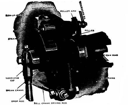 Fig. 896.—The Cooper releasing gear specially designed for high speed. The latching or hooking up operation is performed by a pick up plunger through the action of gravity. The engaging faces of the steel block on the pick up plunger and the steel block on the steam crank are always parallel during their working periods, thus prolonging the wear of the steel block edges.
