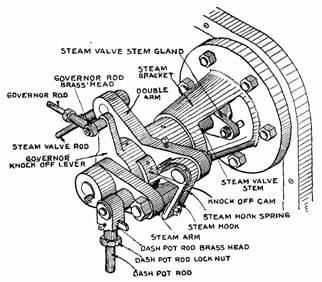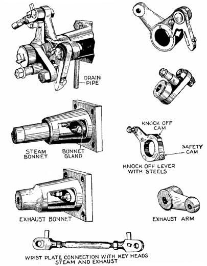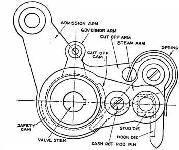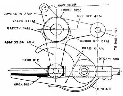 Fig. 900.—The crab claw releasing gear; view showing parts. In operation, the admission arm is moved by the steam rod to the right giving outside admission. When in its movement the crab claw is depressed by the knock off cam, the hook die releases the stud die, and the valve is suddenly closed by the dash pot thus cutting off steam.