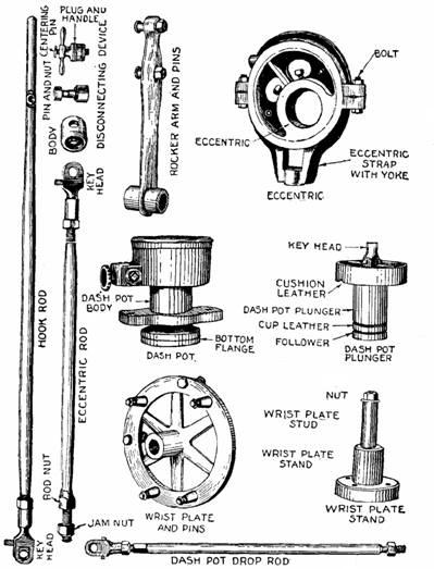 Figs. 882 to 894.—Vilter-Corliss valve gear. Fig. 882, steam valve gear; fig. 883, steam valve gear showing knock off bar; fig. 884 to 893, steam valve gear disassembled; fig. 894, dash pot. The complete valve gear comprises a wrist plate with radial valve rods connecting it to the steam and exhaust valve levers attached to the valve stems, the steam valve stems being fitted with trip blocks, drop levers, knock off levers and drop rods connecting with double vacuum dash pots. The governor cranks are mounted on the valve bonnet, being brought as close to the cylinder as possible. They are provided with fiber knock off cams on top and brass safety cams at the side. The knock off bars are steel forgings, and are keyed to one end of the valve hook stems, on the other end of which are located the valve hook stems, on the other end of which are located the valve hooks or trip pins. The knock off levers are so arranged as to work without springs, but springs are, nevertheless, provided as a safeguard. The trip pins, or valve hooks, as they are sometimes designated, have hardened steel trip plates, with eight wearing edges, which engage corresponding hardened steel trip plates on the dash pot cranks. The trip pins are provided with a special adjustment for regulating the amount of lap of the trip plates. The dash pot cranks are keyed to the valve stems and are provided with pins to which the drop rods are attached. The steam arms are provided with automatic push down or closing pins which engage the dash pot cranks in case of accidental lagging of the dash pot.