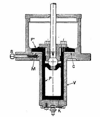 Fig. 931.—The Harris-Corliss dash pot with separate compression cylinder. The parts are V, vacuum cylinder; C, compression cylinder; P. vacuum plunger; P compression piston; K, check valve; M, port to atmosphere; S compression regulating screw.
