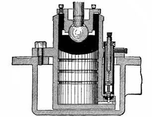Fig. 933.—The Frick-Corliss dash pot. A single cylinder type in which both vacuum and compression are obtained in one cylinder. The regulating device is shown at the right. This pot necessarily operates on a vacuum of lower degree than the separate compression type, hence, a larger plunger is used to obtain the required pull.