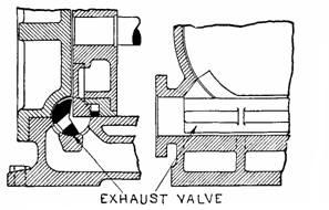 Figs. 938 and 939.—Wisconsin-Corliss small clearance exhaust valve. The clearance is reduced by locating the valve so that its axis is tangent to the cylinder bore; the valve is thus contained partly in the cylinder casting and partly in the cylinder head.