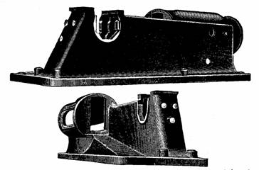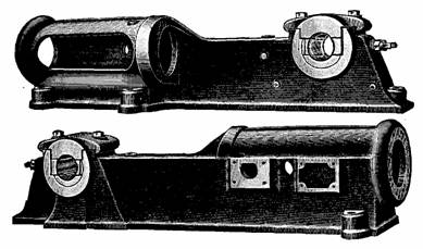 Figs. 944 and 945.—Front and rear views of a girder, or light duty Corliss frame. The backbone projecting from the rear reinforces the frame, and is directly in line with the strain.