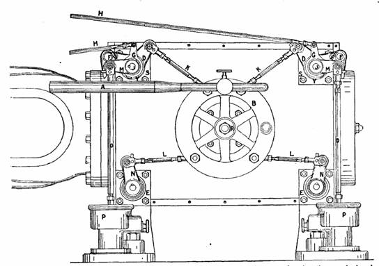 Fig. 961.—Squaring the valves. The wrist plate B, is clamped in neutral position, and the steam valve given the proper lap by adjusting the steam rods K, K; similarly, the exhaust valves are placed in their lap, or neutral position by adjusting the exhaust rods L, L.