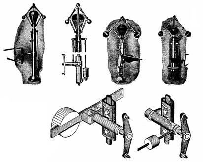 Figs. 897 to 899—Types of Corliss steam valves. Fig. 897 shows an outside admission valve, giving a direct movement with the half moon gear; fig. 898 illustrates inside admission, the valve being operated directly by the oval arm gear. A double admission valve is shown in fig. 899. This valve can be designed to move either way in admitting steam. Outside and inside admission valves may be used with either type of gear, in some cases an indirect eccentric movement is required.