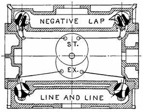 Fig. 973.—Squaring the valves with double eccentrics. The steam valves are set with negative lap which is usually a little less than half the port opening. The usual setting of the exhaust valves is line and line as shown.