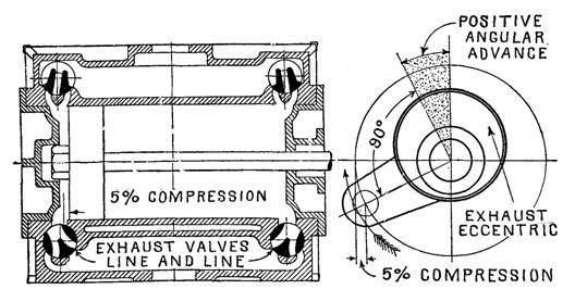 Fig. 974.—Setting the exhaust eccentric. With the piston at the desired point of compression, the exhaust eccentric is advanced until the exhaust valves come in line and line position. The positive angular advance which is given the eccentric is indicated by the shaded angle.