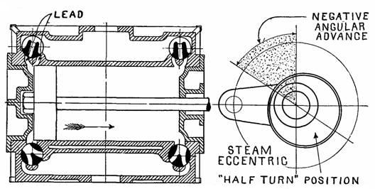 Fig. 975.—Setting the steam eccentric. The engine is placed on the dead center and the eccentric advanced until the valve has the desired lead. Since the steam valves have negative lap, the angular advance will be negative as indicated by the shaded angle. Admission being from the inside the eccentric is set at “half turn” position, that is, 180 degrees from the position of angular advance.