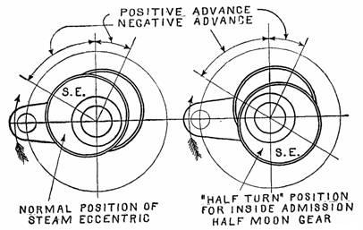 Figs. 976 and 977.—Illustrating normal, and half turn positions of the steam eccentric. The eccentric is placed in its normal position when its center moves in unison with the hook pin on the wrist plate, and at half turn position when they move in opposite directions. For example, the eccentric is set in its normal position for the crab claw and oval arm gears. and at half turn position for an inside admission, half moon gear.